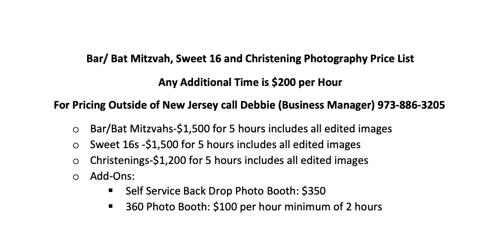 Bar/Bat Mitzvah, Christening and Sweet 16 Price List